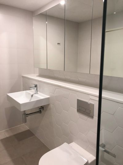 - Stylish bathroom with generous shower and mirrored storage